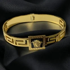 Step into bold elegance with the Kissmis Anti-Tarnish 18K Gold Plated Greek Luxe Medusa Bracelet.