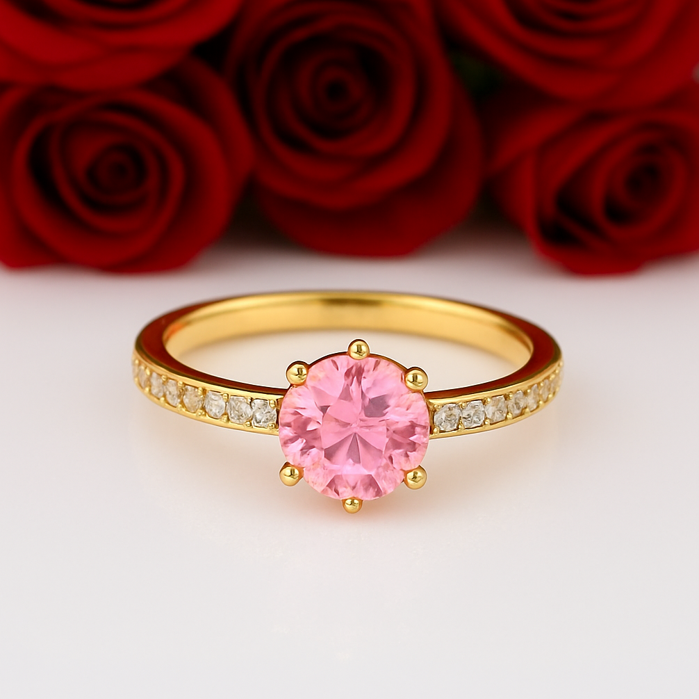 Elevate your special moments with the Kissmis Anti-Tarnish Gold Finish Pink Solitaire Engagement Ring, a symbol of elegance and romance. This exquisite ring features a vibrant round-cut pink stone, securely held in a six-prong setting that enhances its brilliance and charm. The band, finished in rich gold tone, is delicately accented with a row of sparkling micro-set stones, adding extra radiance and sophistication.