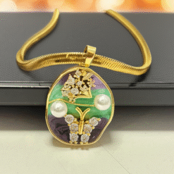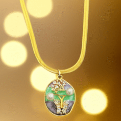 A premium green floral pendant necklace featuring a pearl-accented design and a luxurious 18K gold plated anti-tarnish chain. Elegant, bold, and perfect for both festive and everyday statement looks.