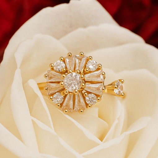 Celebrate timeless beauty with the Kissmis Eternal Bloom Adjustable Ring, a stunning piece inspired by the elegance of blooming flowers. Featuring a dazzling round crystal centerpiece surrounded by delicate petal-like baguette crystals, this ring radiates brilliance from every angle. Crafted with a luxurious anti-tarnish golden band, it combines durability with refined style. Its adjustable design ensures a comfortable fit, making it the perfect statement accessory for both everyday glamour and special occasions.