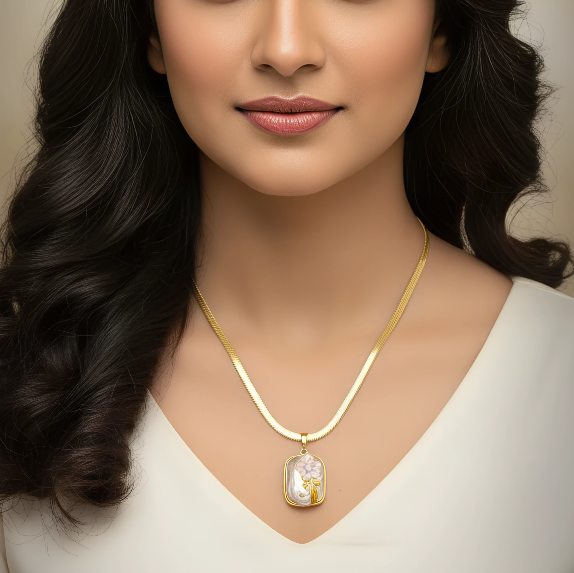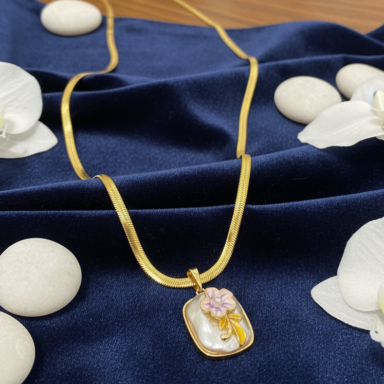 The Kissmis Pearl Blossom Pendant Necklace is designed to bring effortless elegance to your look. The pendant features a beautiful hand-detailed floral motif over a glossy pearl-like base, giving it a rich and graceful finish.